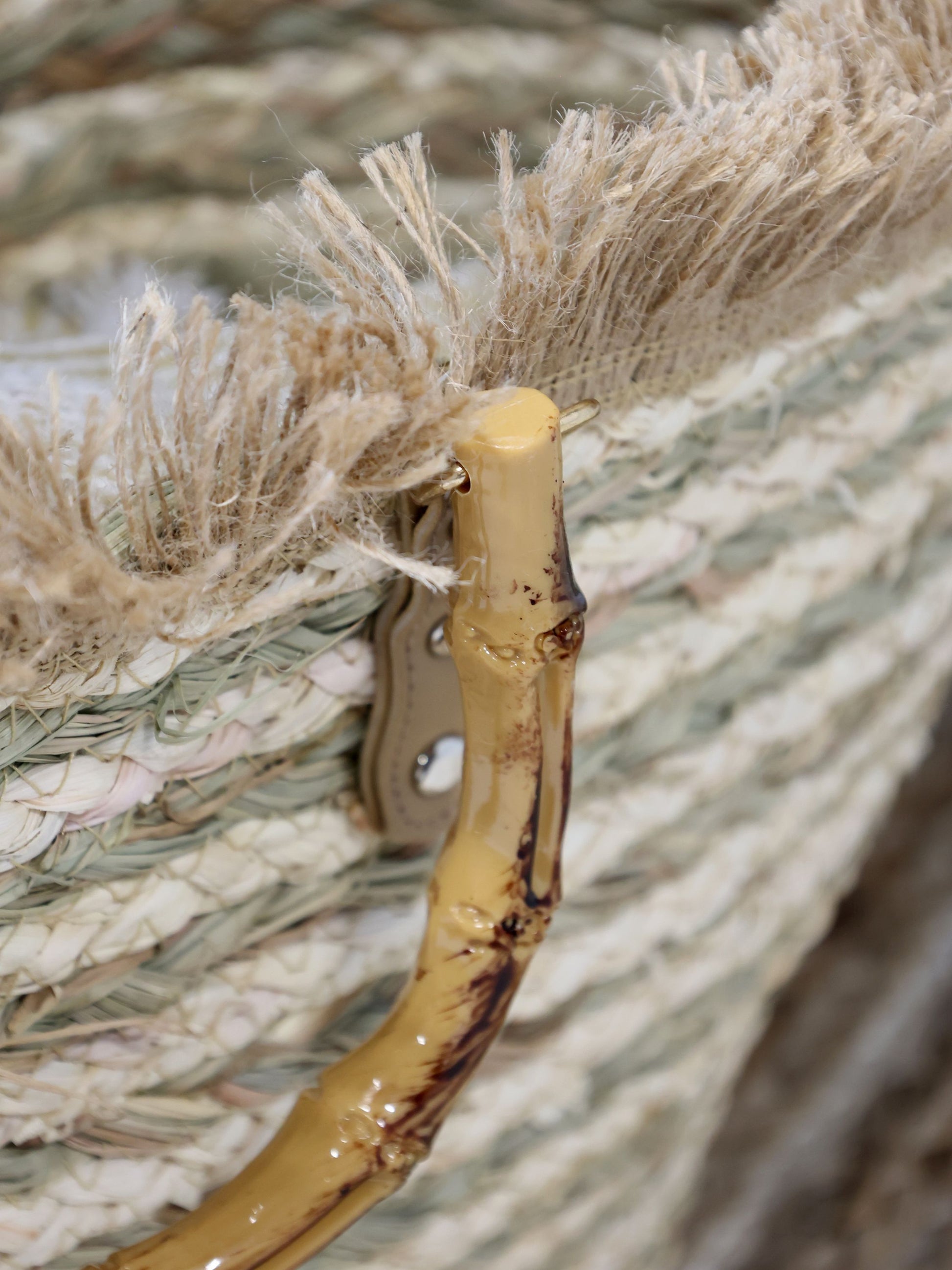 De elegante bambushåndtag giver tasken et eksklusivt look, mens de håndflettede naturmaterialer og de let frynsede kanter tilfører et rustikt og afslappet præg. Tasken er rummelig og let – ideel til hverdagens sommeraktiviteter.