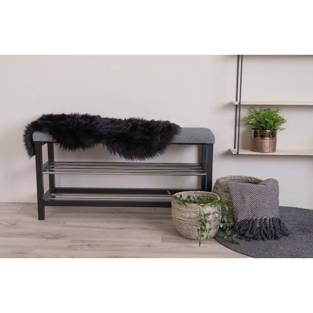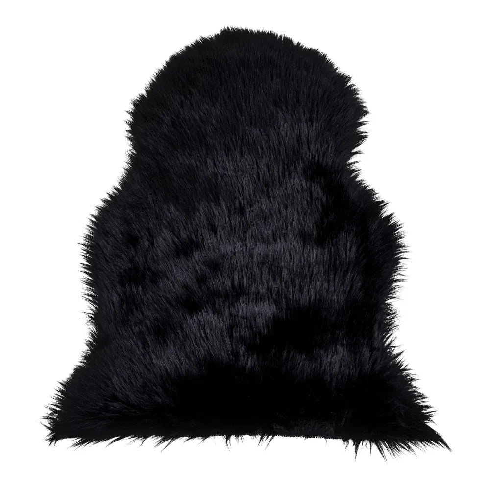 Luksuriøst og blødt lammeskind i imiteret sort, perfekt til at tilføje varme og stil til dit hjem. Måler 50 x 85 cm.