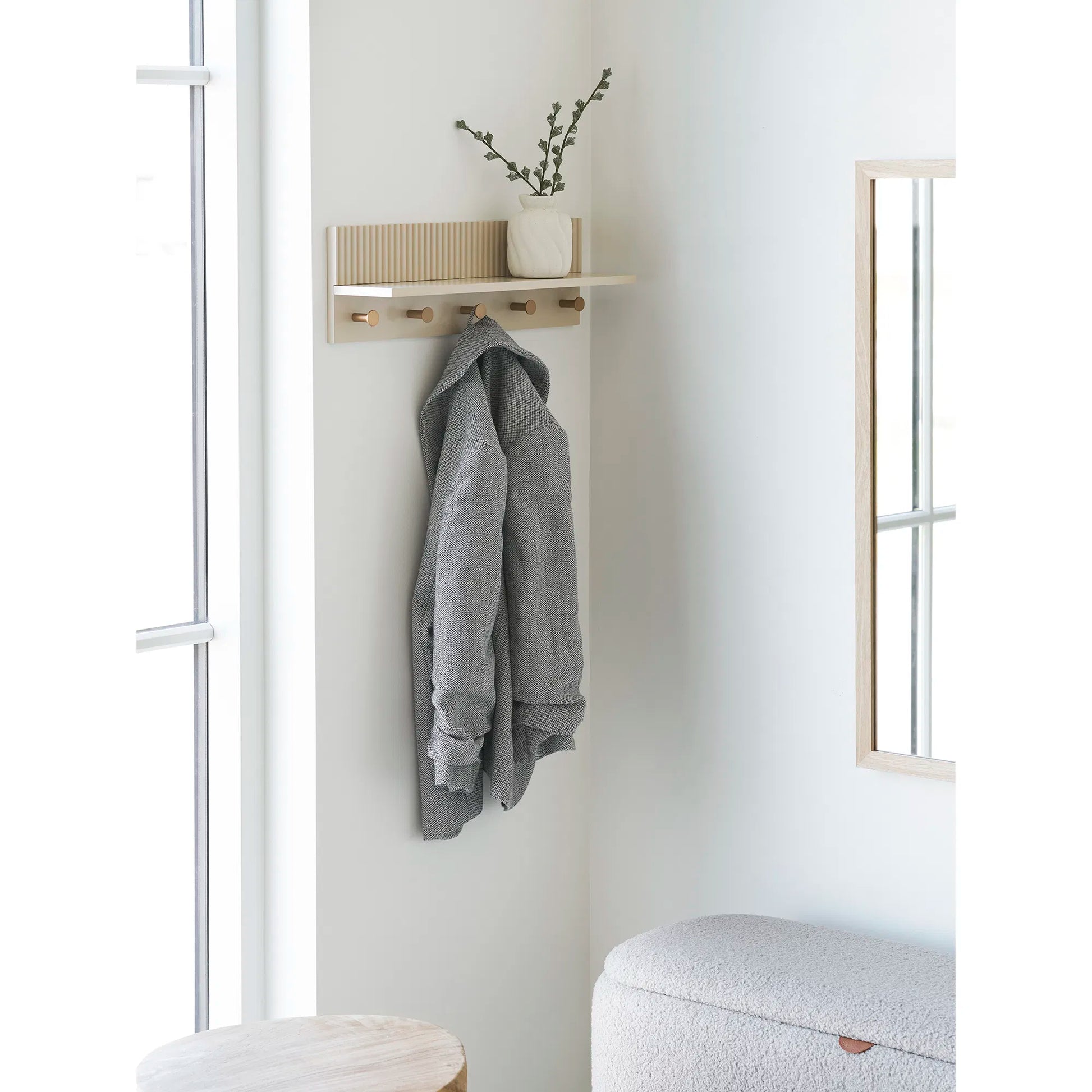 Praktisk og dekorativ væghylde i beige MDF, der kombinerer opbevaringsplads med funktionelle knager. Perfekt til entréen til jakker, nøgler og tasker – eller i køkkenet til viskestykker og småting. Det enkle design gør den nem at indpasse i enhver boligindretning.