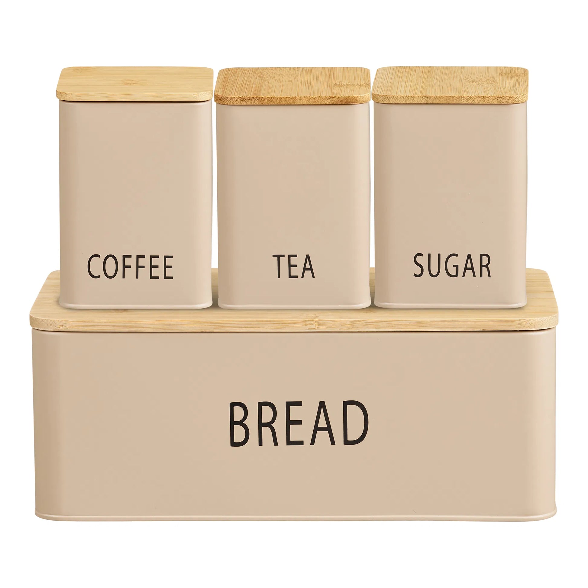 Opgrader din køkkenopbevaring med dette stilrene sæt bestående af en brødkasse og tre matchende dåser i beige metal med låg af bambus. Sættet kombinerer funktionalitet og moderne design og holder dit brød, snacks eller tørvarer friske og pænt organiseret.