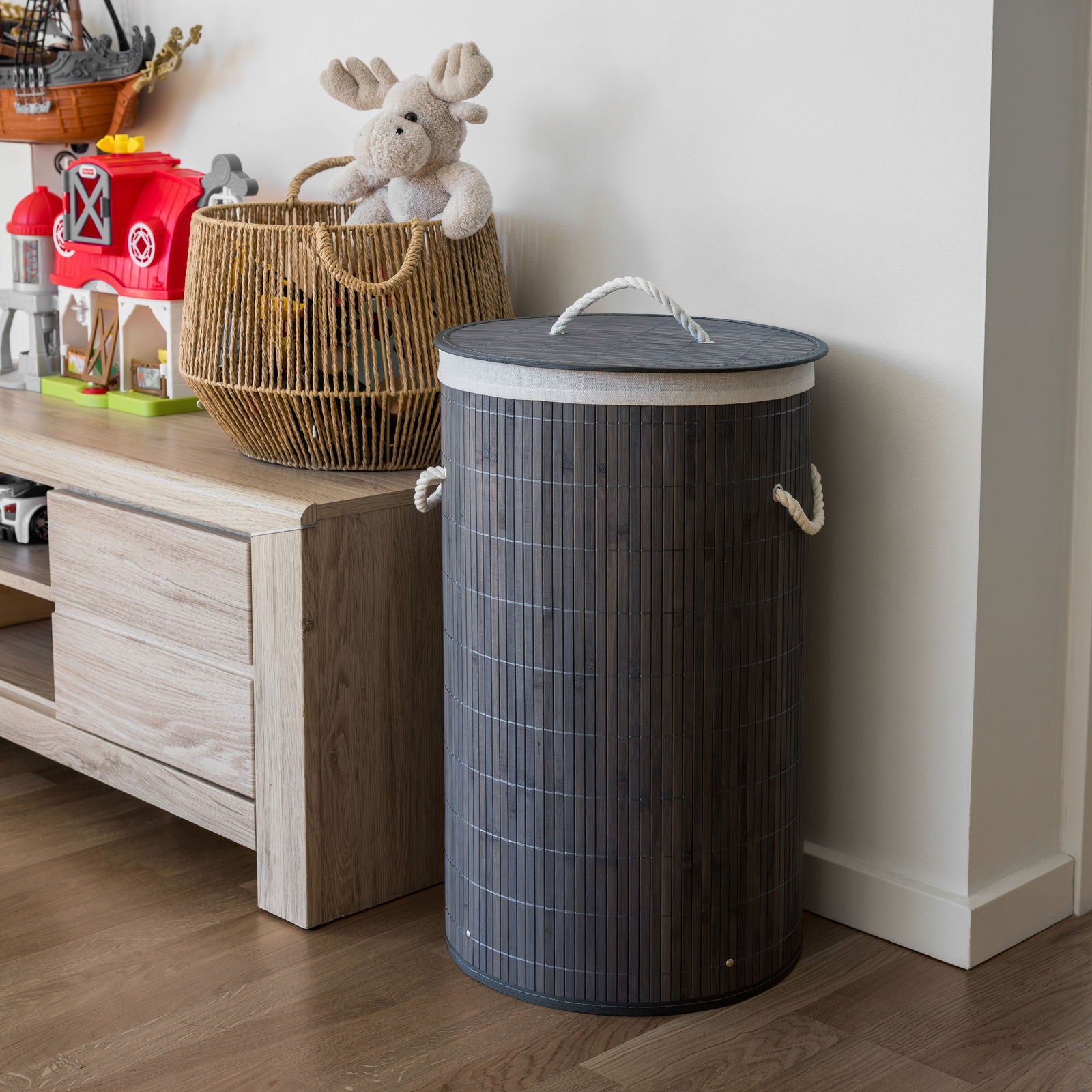 🌿🧺 Nordis – Grå bambus vasketøjskurv 🧺🌿✨