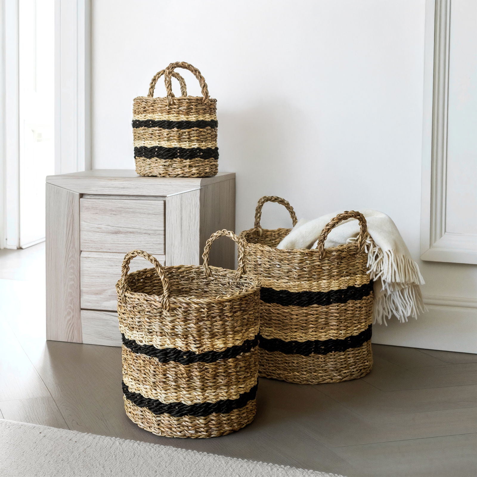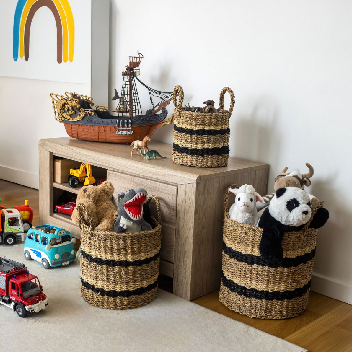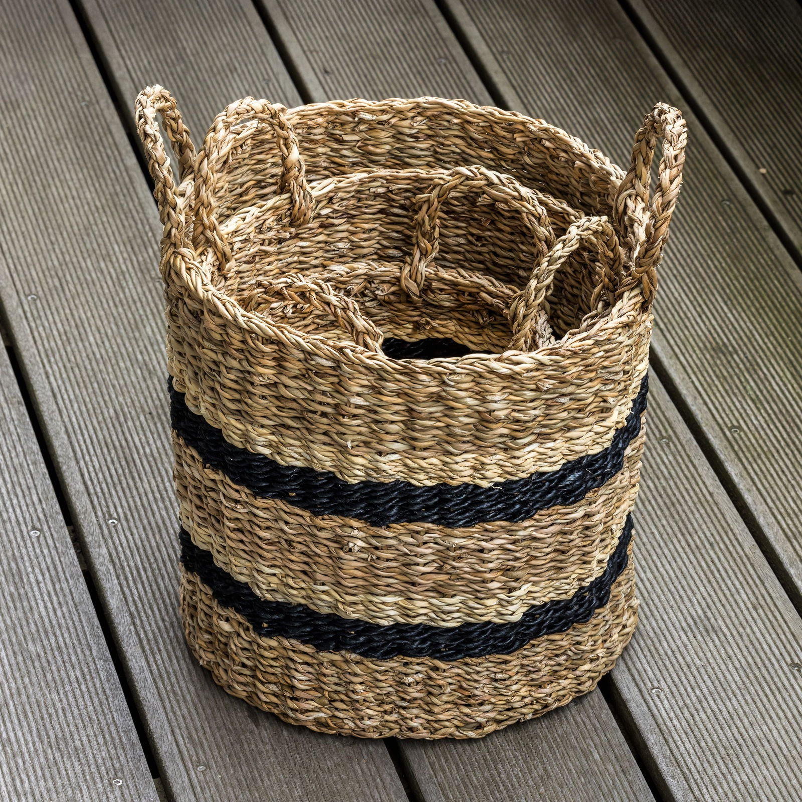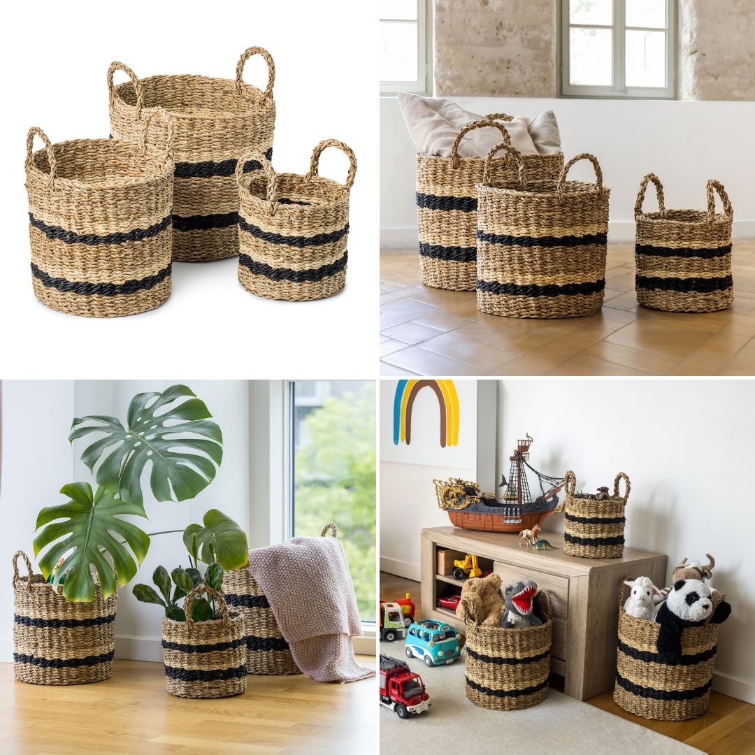 De flettede kurve i søgræs med smukke striber er både dekorative og praktiske – perfekte til at holde styr på hverdagen med stil. 🫶🏼